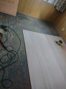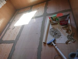 古いじゅうたんを剥がし構造用合板を張りジョイントにパテ処理を丁寧にしました。