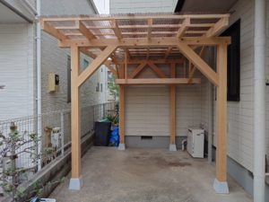広々した駐車場で建物と隔離した木製の明るい屋根をご提案させていただきました。早速、日差しが強くなる季節の前に一生懸命に施工させていただきました。