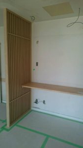 リビングの隅にディスクが欲しいとの事で少しでも集中できるように室内格子で落ち着きある空間にしました。