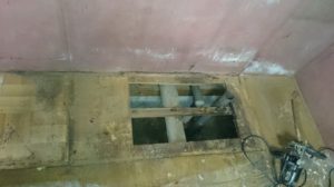 新しく構造用合板を張り、尚且、隙間からゴキブリなどの侵入を防ぐためにアルミ箔のテープを張りました。