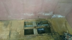 古い流し台を綺麗に取り除き、痛んだ床をはがします。新しい流し台に合わせて、排水の位置を変更します。