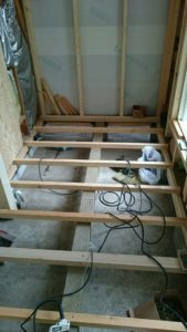 外壁工事が完了すると、いよいよ内装造作工事の下地組です。こちらは床下地組です。