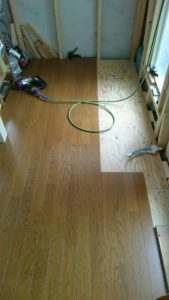 床は玄関ローカに似合わせて、フローリングを張りました。下地には構造用合板を張ることで、二重張りの強度の高い施工をさせて頂きました。